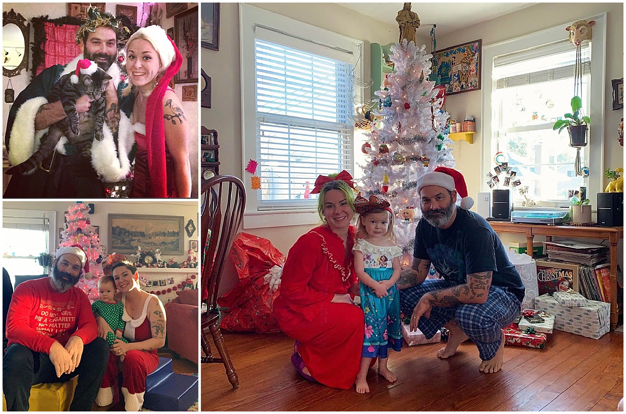 On Christmas morning, before any presents are opened, we suit up in very festive attire and take a family photo in front of the tree. My husband and I have been doing this for about 11 years, and now our kid is in on it too.